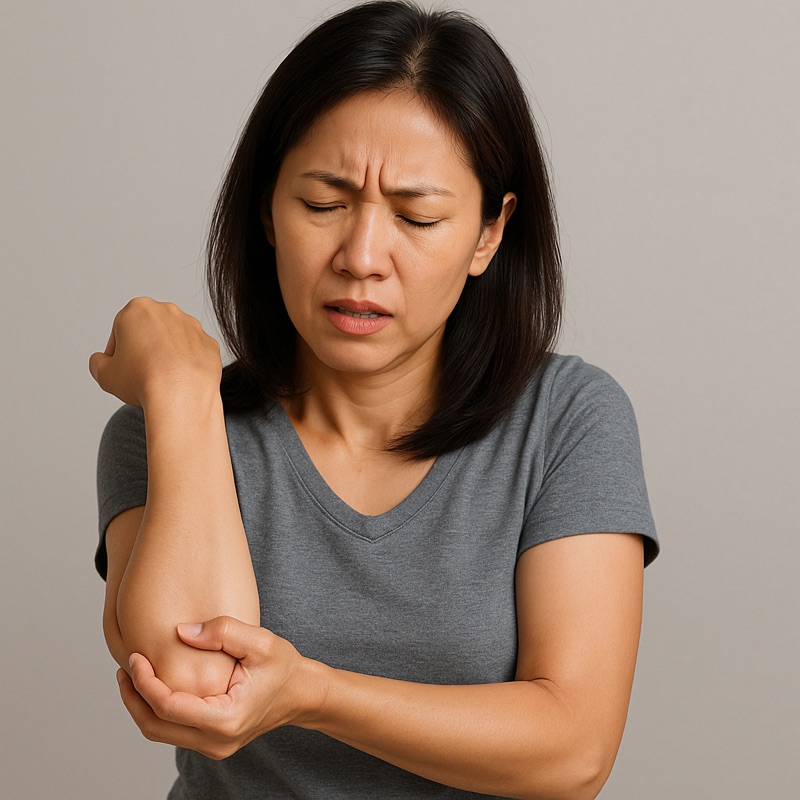 “หมอคะ เจ็บตรงศอกด้านในมากเลยค่ะ พอจับของหนัก ๆ หรือบิดผ้าทีไรปวดจี๊ดทุกครั้ง เป็นมาเป็นเดือนแล้ว”